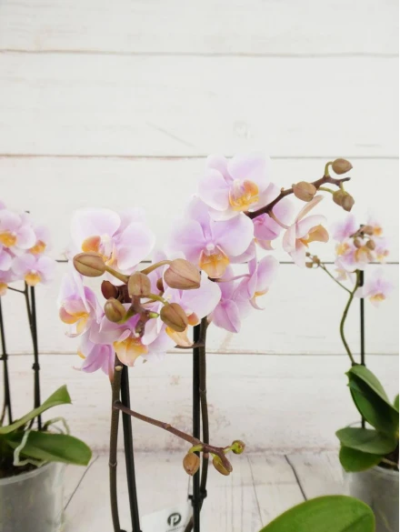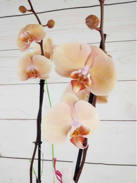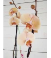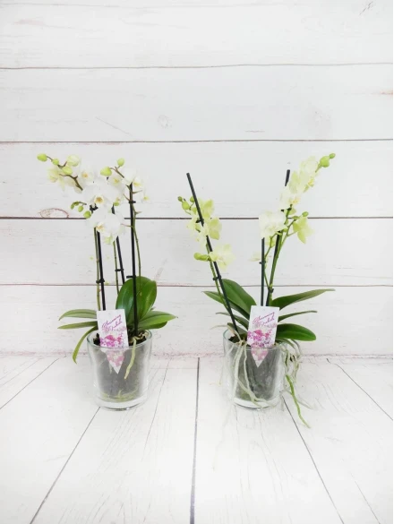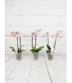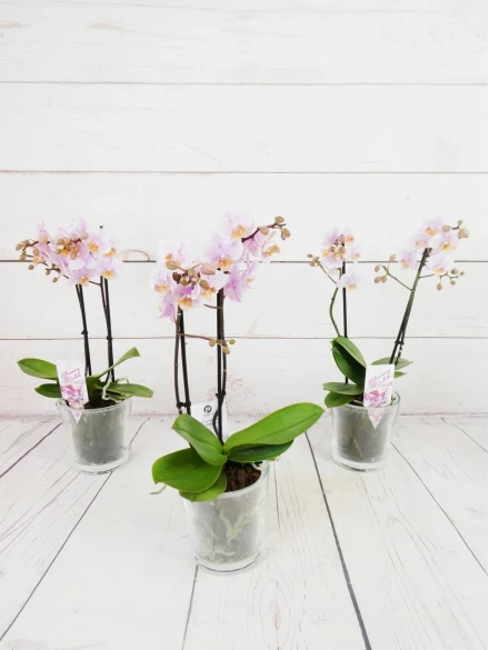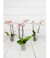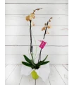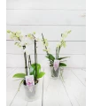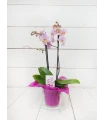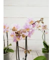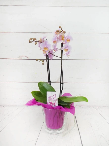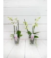 Orquídea mini de 2 tallos color mix, en tonos rosado, fucsia, rosado (colores curiosos y dibujos jaspeados). Con 50 cm de altura, presentada en base de cristal transparente y celofán transparente es un regalo...
