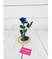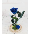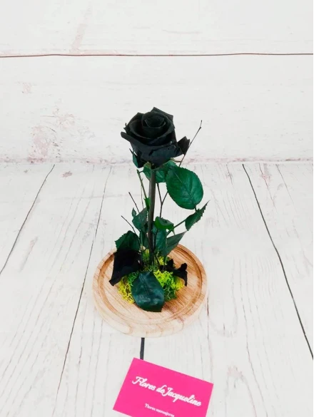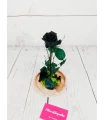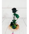 Cúpula de cristal con Rosa Roja Preservada complementada con musgo verde preservado, detalles florales y un pin rojo en forma de corazón.